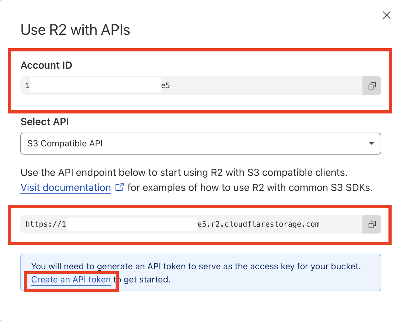 3.7 Click on ‘{}API’ next to the ‘+Create Bucket’ button and select ‘Use R2 with API’. Note your Account ID and bucket (storage) URL.